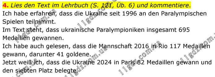 4. Lies den Text im Lehrbuch (S. 121, Üb. 6) und kommentiere. Ich habe erfahren, dass die Ukraine seit 1996 an den Paralympischen Spielen teilnimmt. Im Text steht, dass ukrainische Paralympioniken insgesamt 695 Medaillen gewannen. Ich habe auch gelesen, dass die Mannschaft 2016 in Rio 117 Medaillen gewann, darunter 41 goldene. Jetzt weiß ich, dass die Ukraine 2024 in Paris 82 Medaillen gewann und den siebten Platz belegte.