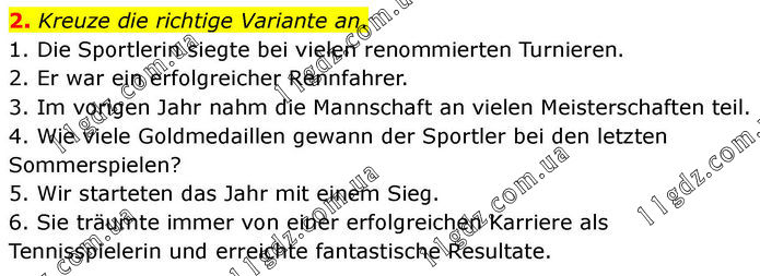 2. Kreuze die richtige Variante an. 1. Die Sportlerin siegte bei vielen renommierten Turnieren. 2. Er war ein erfolgreicher Rennfahrer. 3. Im vorigen Jahr nahm die Mannschaft an vielen Meisterschaften teil. 4. Wie viele Goldmedaillen gewann der Sportler bei den letzten Sommerspielen? 5. Wir starteten das Jahr mit einem Sieg. 6. Sie träumte immer von einer erfolgreichen Karriere als Tennisspielerin und erreichte fantastische Resultate.