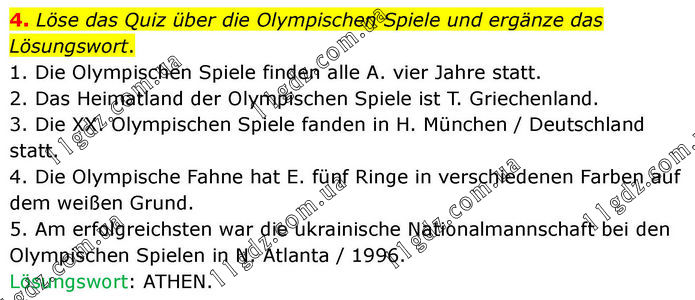 4. Löse das Quiz über die Olympischen Spiele und ergänze das Lösungswort. 1. Die Olympischen Spiele finden alle A. vier Jahre statt. 2. Das Heimatland der Olympischen Spiele ist T. Griechenland. 3. Die XX. Olympischen Spiele fanden in H. München / Deutschland statt. 4. Die Olympische Fahne hat E. fünf Ringe in verschiedenen Farben auf dem weißen Grund. 5. Am erfolgreichsten war die ukrainische Nationalmannschaft bei den Olympischen Spielen in N. Atlanta / 1996. Lösungswort: ATHEN.