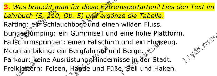 3. Was braucht man für diese Extremsportarten? Lies den Text im Lehrbuch (S. 110, Ob. 5) und ergänze die Tabelle. Rafting: ein Schlauchboot und einen wilden Fluss. Bungeejumping: ein Gummiseil und eine hohe Plattform. Fallschirmspringen: einen Fallschirm und ein Flugzeug. Mountainbiking: ein Bergfahrrad und Berge. Parkour: keine Ausrüstung, Hindernisse in der Stadt. Freiklettern: Felsen, Hände und Füße, Seil und Haken.