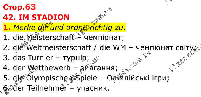 42. IM STADION 1. Merke dir und ordne richtig zu. 1. die Meisterschaft – чемпіонат; 2. die Weltmeisterschaft / die WM – чемпіонат світу; 3. das Turnier – турнір; 4. der Wettbewerb – змагання; 5. die Olympischen Spiele – Олімпійські ігри; 6. der Teilnehmer – учасник.