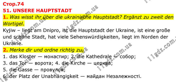 51. UNSERE HAUPTSTADT 1. Was wisst ihr über die ukrainische Hauptstadt? Ergänzt zu zweit den Wortigel. Kyjiw – liegt am Dnipro, ist die Hauptstadt der Ukraine, ist eine große und schöne Stadt, hat viele Sehenswürdigkeiten, liegt im Norden der Ukraine. 2. Merke dir und ordne richtig zu. 1. das Kloster — монастир; 2. die Kathedrale — собор; 3. das Tor — ворота; 4. die Kirche — церква; 5. die Gasse — провулок; 6. der Platz der Unabhängigkeit — майдан Незалежності.
