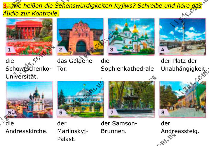 3. Wie heißen die Sehenswürdigkeiten Kyjiws? Schreibe und höre das Audio zur Kontrolle. die Schewtschenko-Universität. das Goldene Tor. die Sophienkathedrale. der Platz der Unabhängigkeit. die Andreaskirche. der Mariinskyj-Palast. der Samson-Brunnen. der Andreassteig.
