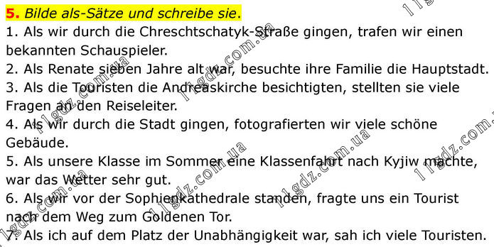 5. Bilde als-Sätze und schreibe sie. 1. Als wir durch die Chreschtschatyk-Straße gingen, trafen wir einen bekannten Schauspieler. 2. Als Renate sieben Jahre alt war, besuchte ihre Familie die Hauptstadt. 3. Als die Touristen die Andreaskirche besichtigten, stellten sie viele Fragen an den Reiseleiter. 4. Als wir durch die Stadt gingen, fotografierten wir viele schöne Gebäude. 5. Als unsere Klasse im Sommer eine Klassenfahrt nach Kyjiw machte, war das Wetter sehr gut. 6. Als wir vor der Sophienkathedrale standen, fragte uns ein Tourist nach dem Weg zum Goldenen Tor. 7. Als ich auf dem Platz der Unabhängigkeit war, sah ich viele Touristen.
