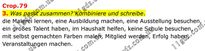 3. Was passt zusammen? Kombiniere und schreibe. die Malerei lernen, eine Ausbildung machen, eine Ausstellung besuchen, ein großes Talent haben, im Haushalt helfen, keine Schule besuchen, mit selbst gemachten Farben malen, Mitglied werden, Erfolg haben, Veranstaltungen machen.