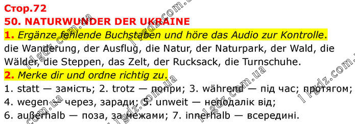 50. NATURWUNDER DER UKRAINE 1. Ergänze fehlende Buchstaben und höre das Audio zur Kontrolle. die Wanderung, der Ausflug, die Natur, der Naturpark, der Wald, die Wälder, die Steppen, das Zelt, der Rucksack, die Turnschuhe. 2. Merke dir und ordne richtig zu. 1. statt — замість; 2. trotz — попри; 3. während — під час; протягом; 4. wegen — через, заради; 5. unweit — неподалік від; 6. außerhalb — поза, за межами; 7. innerhalb — всередині.