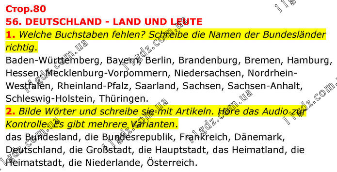56. DEUTSCHLAND - LAND UND LEUTE 1. Welche Buchstaben fehlen? Schreibe die Namen der Bundesländer richtig. Baden-Württemberg, Bayern, Berlin, Brandenburg, Bremen, Hamburg, Hessen, Mecklenburg-Vorpommern, Niedersachsen, Nordrhein-Westfalen, Rheinland-Pfalz, Saarland, Sachsen, Sachsen-Anhalt, Schleswig-Holstein, Thüringen. 2. Bilde Wörter und schreibe sie mit Artikeln. Höre das Audio zur Kontrolle. Es gibt mehrere Varianten. das Bundesland, die Bundesrepublik, Frankreich, Dänemark, Deutschland, die Großstadt, die Hauptstadt, das Heimatland, die Heimatstadt, die Niederlande, Österreich.