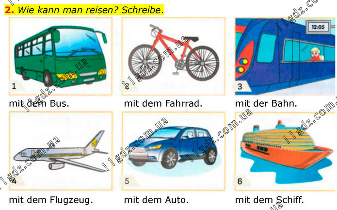 2. Wie kann man reisen? Schreibe. mit dem Bus. mit dem Fahrrad. mit der Bahn. mit dem Flugzeug. mit dem Auto. mit dem Schiff.