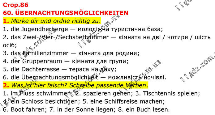 60. ÜBERNACHTUNGSMÖGLICHKEITEN 1. Merke dir und ordne richtig zu. 1. die Jugendherberge — молодіжна туристична база; 2. das Zwei-/Vier-/Sechsbettzimmer — кімната на дві / чотири / шість осіб; 3. das Familienzimmer — кімната для родини; 4. der Gruppenraum — кімната для групи; 5. die Dachterrasse — тераса на даху; 6. die Übernachtungsmöglichkeit — можливість ночівлі. 2. Was ist hier falsch? Schreibe passende Verben. 1. im Fluss schwimmen; 2. spazieren gehen; 3. Tischtennis spielen; 4. ein Schloss besichtigen; 5. eine Schiffsreise machen; 6. Boot fahren; 7. in der Sonne liegen; 8. ein Buch lesen.
