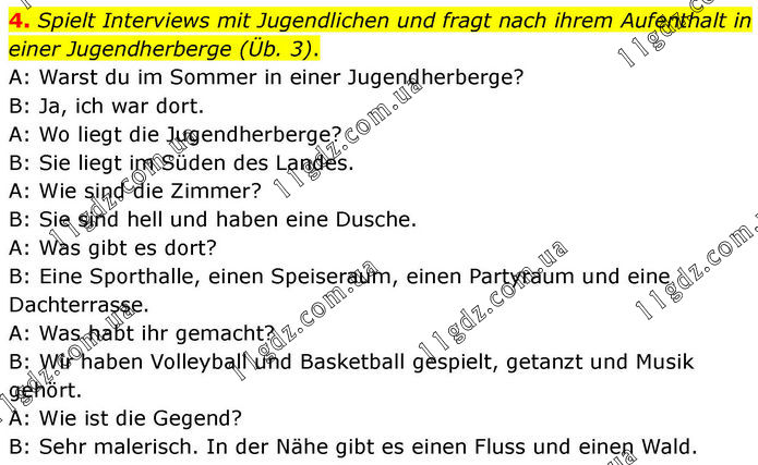 4. Spielt Interviews mit Jugendlichen und fragt nach ihrem Aufenthalt in einer Jugendherberge (Üb. 3). A: Warst du im Sommer in einer Jugendherberge? B: Ja, ich war dort. A: Wo liegt die Jugendherberge? B: Sie liegt im Süden des Landes. A: Wie sind die Zimmer? B: Sie sind hell und haben eine Dusche. A: Was gibt es dort? B: Eine Sporthalle, einen Speiseraum, einen Partyraum und eine Dachterrasse. A: Was habt ihr gemacht? B: Wir haben Volleyball und Basketball gespielt, getanzt und Musik gehört. A: Wie ist die Gegend? B: Sehr malerisch. In der Nähe gibt es einen Fluss und einen Wald.