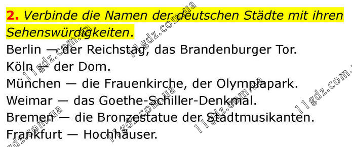 2. Verbinde die Namen der deutschen Städte mit ihren Sehenswürdigkeiten. Berlin — der Reichstag, das Brandenburger Tor. Köln — der Dom. München — die Frauenkirche, der Olympiapark. Weimar — das Goethe-Schiller-Denkmal. Bremen — die Bronzestatue der Stadtmusikanten. Frankfurt — Hochhäuser.