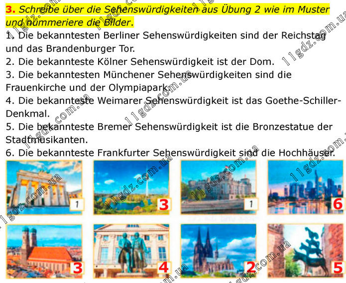 3. Schreibe über die Sehenswürdigkeiten aus Übung 2 wie im Muster und nummeriere die Bilder. 1. Die bekanntesten Berliner Sehenswürdigkeiten sind der Reichstag und das Brandenburger Tor. 2. Die bekannteste Kölner Sehenswürdigkeit ist der Dom. 3. Die bekanntesten Münchener Sehenswürdigkeiten sind die Frauenkirche und der Olympiapark. 4. Die bekannteste Weimarer Sehenswürdigkeit ist das Goethe-Schiller-Denkmal. 5. Die bekannteste Bremer Sehenswürdigkeit ist die Bronzestatue der Stadtmusikanten. 6. Die bekannteste Frankfurter Sehenswürdigkeit sind die Hochhäuser.