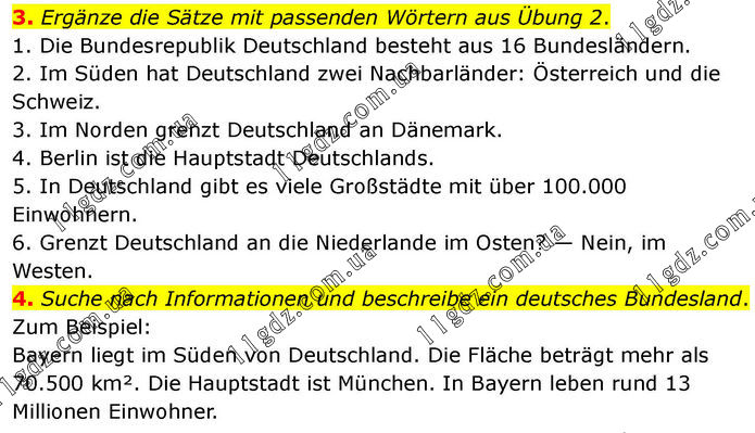 3. Ergänze die Sätze mit passenden Wörtern aus Übung 2. 1. Die Bundesrepublik Deutschland besteht aus 16 Bundesländern. 2. Im Süden hat Deutschland zwei Nachbarländer: Österreich und die Schweiz. 3. Im Norden grenzt Deutschland an Dänemark. 4. Berlin ist die Hauptstadt Deutschlands. 5. In Deutschland gibt es viele Großstädte mit über 100.000 Einwohnern. 6. Grenzt Deutschland an die Niederlande im Osten? — Nein, im Westen. 4. Suche nach Informationen und beschreibe ein deutsches Bundesland. Zum Beispiel: Bayern liegt im Süden von Deutschland. Die Fläche beträgt mehr als 70.500 km². Die Hauptstadt ist München. In Bayern leben rund 13 Millionen Einwohner.