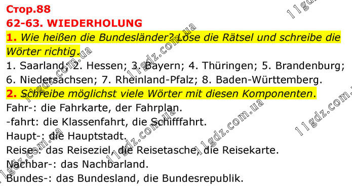 62-63. WIEDERHOLUNG 1. Wie heißen die Bundesländer? Löse die Rätsel und schreibe die Wörter richtig. 1. Saarland; 2. Hessen; 3. Bayern; 4. Thüringen; 5. Brandenburg; 6. Niedersachsen; 7. Rheinland-Pfalz; 8. Baden-Württemberg. 2. Schreibe möglichst viele Wörter mit diesen Komponenten. Fahr-: die Fahrkarte, der Fahrplan. -fahrt: die Klassenfahrt, die Schifffahrt. Haupt-: die Hauptstadt. Reise-: das Reiseziel, die Reisetasche, die Reisekarte. Nachbar-: das Nachbarland. Bundes-: das Bundesland, die Bundesrepublik.
