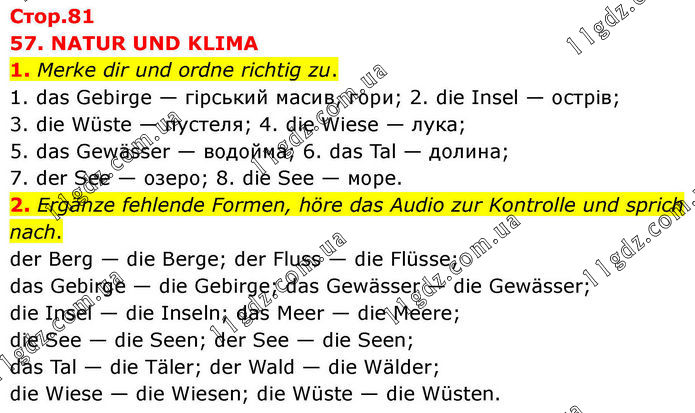 57. NATUR UND KLIMA 1. Merke dir und ordne richtig zu. 1. das Gebirge — гірський масив, гори; 2. die Insel — острів; 3. die Wüste — пустеля; 4. die Wiese — лука; 5. das Gewässer — водойма; 6. das Tal — долина; 7. der See — озеро; 8. die See — море. 2. Ergänze fehlende Formen, höre das Audio zur Kontrolle und sprich nach. der Berg — die Berge; der Fluss — die Flüsse; das Gebirge — die Gebirge; das Gewässer — die Gewässer; die Insel — die Inseln; das Meer — die Meere; die See — die Seen; der See — die Seen; das Tal — die Täler; der Wald — die Wälder; die Wiese — die Wiesen; die Wüste — die Wüsten.