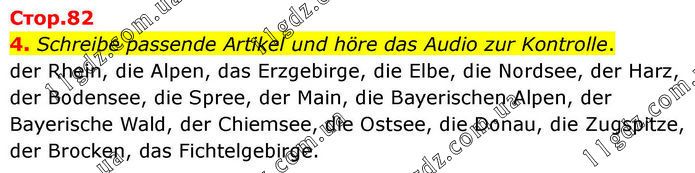 4. Schreibe passende Artikel und höre das Audio zur Kontrolle. der Rhein, die Alpen, das Erzgebirge, die Elbe, die Nordsee, der Harz, der Bodensee, die Spree, der Main, die Bayerischen Alpen, der Bayerische Wald, der Chiemsee, die Ostsee, die Donau, die Zugspitze, der Brocken, das Fichtelgebirge.