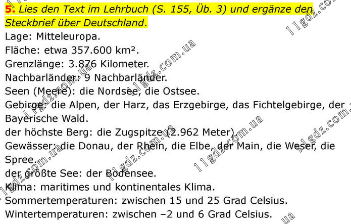 5. Lies den Text im Lehrbuch (S. 155, Üb. 3) und ergänze den Steckbrief über Deutschland. Lage: Mitteleuropa. Fläche: etwa 357.600 km². Grenzlänge: 3.876 Kilometer. Nachbarländer: 9 Nachbarländer. Seen (Meere): die Nordsee, die Ostsee. Gebirge: die Alpen, der Harz, das Erzgebirge, das Fichtelgebirge, der Bayerische Wald. der höchste Berg: die Zugspitze (2.962 Meter). Gewässer: die Donau, der Rhein, die Elbe, der Main, die Weser, die Spree. der größte See: der Bodensee. Klima: maritimes und kontinentales Klima. Sommertemperaturen: zwischen 15 und 25 Grad Celsius. Wintertemperaturen: zwischen –2 und 6 Grad Celsius.