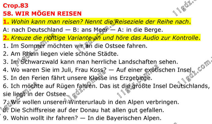 58. WIR MÖGEN REISEN 1. Wohin kann man reisen? Nennt die Reiseziele der Reihe nach. A: nach Deutschland — B: ans Meer — A: in die Berge. 2. Kreuze die richtige Variante an und höre das Audio zur Kontrolle. 1. Im Sommer möchten wir an die Ostsee fahren. 2. Am Rhein liegen viele schöne Städte. 3. Im Schwarzwald kann man herrliche Landschaften sehen. 4. Wo waren Sie im Juli, Frau Koss? — Auf einer exotischen Insel. 5. In den Ferien fährt unsere Klasse ins Erzgebirge. 6. Ich möchte auf Rügen fahren. Das ist die größte Insel Deutschlands, sie liegt in der Ostsee. 7. Wir wollen unseren Winterurlaub in den Alpen verbringen. 8. Die Schiffsreise auf der Donau hat allen gut gefallen. 9. Wohin wollt ihr fahren? — In die Bayerischen Alpen.