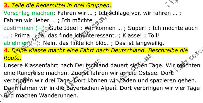 3. Teile die Redemittel in drei Gruppen. Vorschlag machen: Fahren wir … ; Ich schlage vor, wir fahren … ; Fahren wir lieber … ; Ich möchte … zustimmen (+): Gute Idee! ; Wir können … ; Super! ; Ich möchte auch … ; Prima! ; Ja, das finde ich interessant. ; Klasse! ; Toll! ablehnen (–): Nein, das finde ich blöd. ; Das ist langweilig. 4. Deine Klasse macht eine Fahrt nach Deutschland. Beschreibe die Route. Unsere Klassenfahrt nach Deutschland dauert sieben Tage. Wir möchten eine Rundreise machen. Zuerst fahren wir an die Ostsee. Dort verbringen wir drei Tage. Dort können wir baden und spazieren gehen. Dann fahren wir in die Bayerischen Alpen. Dort verbringen wir vier Tage und machen Wanderungen.