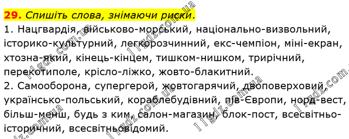 Спишіть слова, знімаючи риски. 1. Нацгвардія, військово-морський, національно-визвольний, історико-культурний, легкорозчинний, екс-чемпіон, міні-екран, хтозна-який, кінець-кінцем, тишком-нишком, трирічний, перекотиполе, крісло-ліжко, жовто-блакитний. 2. Самооборона, супергерой, жовтогарячий, двоповерховий, українсько-польський, кораблебудівний, пів-Європи, норд-вест, більш-менш, будь з ким, салон-магазин, блок-пост, всесвітньо-історичний, всесвітньовідомий.