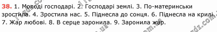 1. Молоді господарі. 2. Господарі землі. 3. По-материнськи зростила. 4. Зростила нас. 5. Піднесла до сонця. 6. Піднесла на крилі. 7. Жар любові. 8. В серце заронила. 9. Заронила жар.