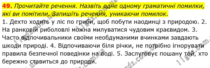Прочитайте речення. Назвіть одне одному граматичні помилки, які ви помітили. Запишіть речення, уникаючи помилок. 1. Дехто ходить у ліс по гриби, щоб побути наодинці з природою. 2. На ранковій риболовлі можна милуватися чудовим краєвидом. 3. Часто відпочивальники своїми необдуманими вчинками завдають шкоди природі. 4. Відпочиваючи біля річки, не потрібно ігнорувати правила безпечної поведінки на воді. 5. Заслуговує пошану той, хто бережно ставиться до природи.