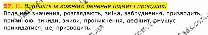Випишіть із кожного речення підмет і присудок. Вода має значення, розглядають, зміна, забруднення, призводить, причиною, викиди, змиви