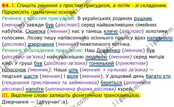 I. Спишіть речення з простим присудком, а потім - зі складеним. Підкресліть граматичні основи. Речення з простим присудком: В українських родинах рушник (іменник) завжди був (дієслово) серед найважливіших сімейних набутків. Скрипка (іменник) нас у танець кличе (дієслово) золотими голосами. Лісову тишу напівсонного осіннього пралісу враз наповнило (дієслово) дзюрчання (іменник) невеличкого потічка. Речення зі складеним присудком: Наш Довженко (іменник) був (дієслово-зв'язка) найсучаснішою людиною (іменник) серед митців кіно. У груші був (дієслово-зв'язка) тоненький (прикметник) голосочок (іменник). Наша ціль (іменник + нульова зв’язка) — людське щастя (іменник) і воля (іменник). У дощовий день багато хто (поєднання прислівника та займенника) береться (допоміжне дієслово) напоїти (неозначена форма дієслова) курей. IІI. Виділене слово запишіть фонетичною транскрипцією. Дзюрчання — [дз’урчан’:а].