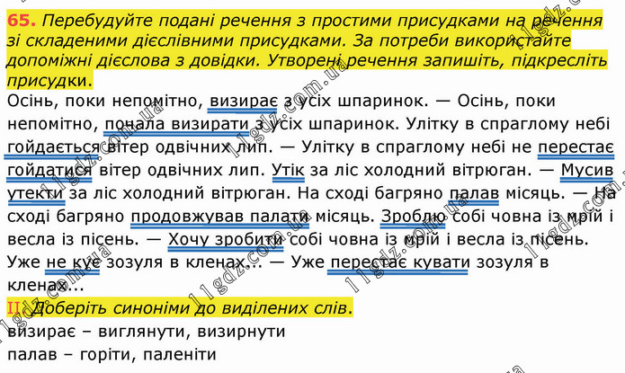 Перебудуйте подані речення з простими присудками на речення зі складеними дієслівними присудками. За потреби використайте допоміжні дієслова з довідки. Утворені речення запишіть, підкресліть присудки. Осінь, поки непомітно, визирає з усіх шпаринок. — Осінь, поки непомітно, почала визирати з усіх шпаринок. Улітку в спраглому небі гойдається вітер одвічних лип. — Улітку в спраглому небі не перестає гойдатися вітер одвічних лип. Утік за ліс холодний вітрюган. — Мусив утекти за ліс холодний вітрюган. На сході багряно палав місяць. — На сході багряно продовжував палати місяць. Зроблю собі човна із мрій і весла із пісень. — Хочу зробити собі човна із мрій і весла із пісень. Уже не кує зозуля в кленах... — Уже перестає кувати зозуля в кленах... ІІ. Доберіть синоніми до виділених слів. визирає – виглянути, визирнути палав – горіти, паленіти