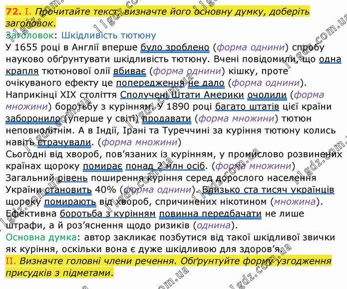 Прочитайте текст, визначте його основну думку, доберіть заголовок. Заголовок: Шкідливість тютюну У 1655 році в Англії вперше було зроблено (форма однини) спробу науково обґрунтувати шкідливість тютюну. Вчені повідомили, що одна крапля тютюнової олії вбиває (форма однини) кішку, проте очікуваного ефекту це попередження не дало (форма однини). Визначте головні члени речення. Обґрунтуйте форму узгодження присудків з підметами.