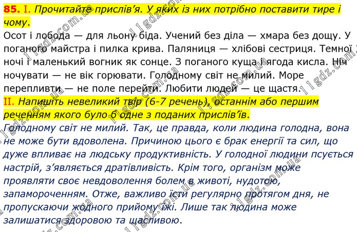 І. Прочитайте прислів’я. У яких із них потрібно поставити тире і чому. Осот і лобода — для льону біда. Учений без діла — хмара без дощу. У поганого майстра і пилка крива. Паляниця — хлібові сестриця. Темної ночі і маленький вогник як сонце. З поганого куща і ягода кисла. Ніч ночувати — не вік горювати. Голодному світ не милий. Море перепливти — не поле перейти. Любити людей — це щастя. II. Напишіть невеликий твір (6-7 речень), останнім або першим реченням якого було б одне з поданих прислів’їв. Голодному світ не милий. Так, це правда, коли людина голодна, вона не може бути вдоволена. Причиною цього є брак енергії та сил, що дуже впливає на людську продуктивність. У голодної людини псується настрій, з’являється дратівливість. Крім того, організм може проявляти своє невдоволення болем в животі, нудотою, запамороченням. Отже, важливо їсти регулярно протягом дня, не пропускаючи жодного прийому їжі. Лише так людина може залишатися здоровою та щасливою.