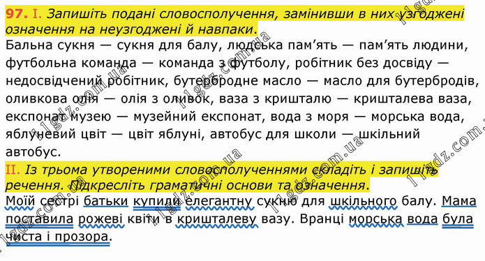 І. Запишіть подані словосполучення, замінивши в них узгоджені означення на неузгоджені й навпаки. Бальна сукня — сукня для балу, людська пам’ять — пам’ять людини, футбольна команда — команда з футболу, робітник без досвіду — недосвідчений робітник, бутербродне масло — масло для бутербродів, оливкова олія — олія з оливок, ваза з кришталю — кришталева ваза, експонат музею — музейний експонат, вода з моря — морська вода, яблуневий цвіт — цвіт яблуні, автобус для школи — шкільний автобус. II. Із трьома утвореними словосполученнями складіть і запишіть речення. Підкресліть граматичні основи та означення. Моїй сестрі батьки купили елегантну сукню для шкільного балу. Мама поставила рожеві квіти в кришталеву вазу. Вранці морська вода була чиста і прозора.