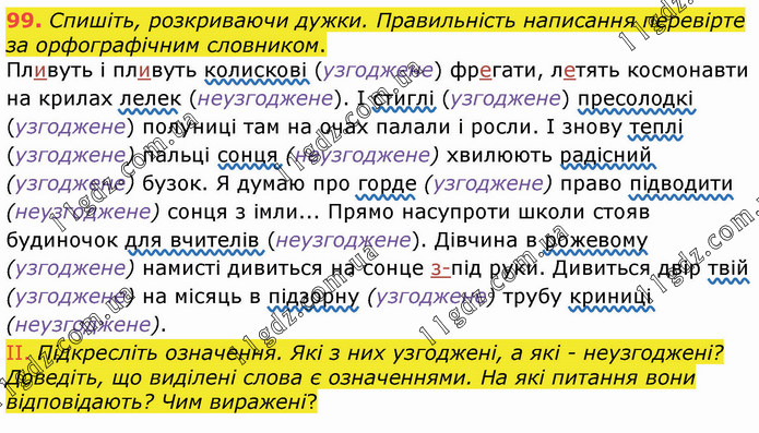 Спишіть, розкриваючи дужки. Правильність написання перевірте за орфографічним словником. Пливуть і пливуть колискові (узгоджене) фрегати, летять космонавти на крилах лелек (неузгоджене). І стиглі (узгоджене) пресолодкі (узгоджене) полуниці там на очах палали і росли. І знову теплі (узгоджене) пальці сонця (неузгоджене) хвилюють радісний (узгоджене) бузок. Я думаю про горде (узгоджене) право підводити (неузгоджене) сонця з імли... Прямо насупроти школи стояв будиночок для вчителів (неузгоджене). Дівчина в рожевому (узгоджене) намисті дивиться на сонце з-під руки. Дивиться двір твій (узгоджене) на місяць в підзорну (узгоджене) трубу криниці (неузгоджене). ІІ. Підкресліть означення. Які з них узгоджені, а які - неузгоджені? Доведіть, що виділені слова є означеннями. На які питання вони відповідають? Чим виражені?