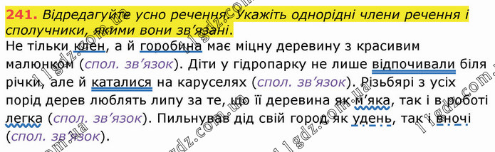 Відредагуйте усно речення. Укажіть однорідні члени речення і сполучники, якими вони зв’язані. Не тільки клен, а й горобина має міцну деревину з красивим малюнком (спол. зв’язок). Діти у гідропарку не лише відпочивали біля річки, але й каталися на каруселях (спол. зв’язок). Різьбярі з усіх порід дерев люблять липу за те, що її деревина як м’яка, так і в роботі легка (спол. зв’язок). Пильнував дід свій город як удень, так і вночі (спол. зв’язок).