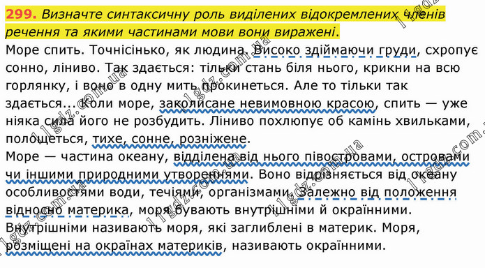 Визначте синтаксичну роль виділених відокремлених членів речення та якими частинами мови вони виражені. Море спить. Точнісінько, як людина. Високо здіймаючи груди, схропує сонно, ліниво. Так здається: тільки стань біля нього, крикни на всю горлянку, і воно в одну мить прокинеться. Але то тільки так здається... Коли море, заколисане невимовною красою, спить — уже ніяка сила його не розбудить. Ліниво похлюпує об камінь хвильками, полощеться, тихе, сонне, розніжене. Море — частина океану, відділена від нього півостровами, островами чи іншими природними утвореннями. Воно відрізняється від океану особливостями води, течіями, організмами. Залежно від положення відносно материка, моря бувають внутрішніми й окраїнними. Внутрішніми називають моря, які заглиблені в материк. Моря, розміщені на окраїнах материків, називають окраїнними.