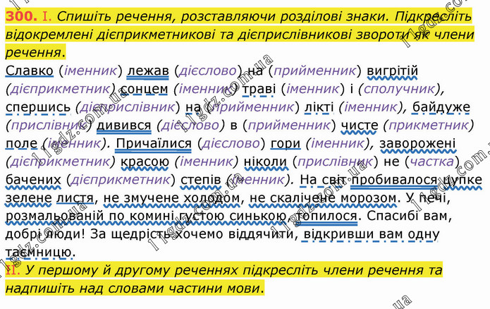 І. Спишіть речення, розставляючи розділові знаки. Підкресліть відокремлені дієприкметникові та дієприслівникові звороти як члени речення. Славко (іменник) лежав (дієслово) на (прийменник) вигрітій (дієприкметник) сонцем (іменник) траві (іменник) і (сполучник), спершись (дієприслівник) на (прийменник) лікті (іменник), байдуже (прислівник) дивився (дієслово) в (прийменник) чисте (прикметник) поле (іменник). Причаїлися (дієслово) гори (іменник), заворожені (дієприкметник) красою (іменник) ніколи (прислівник) не (частка) бачених (дієприкметник) степів (іменник). На світ пробивалося цупке зелене листя, не змучене холодом, не скалічене морозом. У печі, розмальованій по комині густою синькою, топилося. Спасибі вам, добрі люди! За щедрість хочемо віддячити, відкривши вам одну таємницю. ІІ. У першому й другому реченнях підкресліть члени речення та надпишіть над словами частини мови.