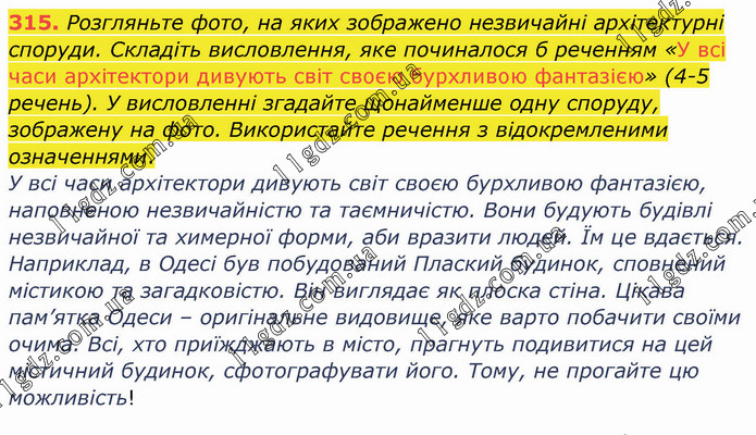 Розгляньте фото, на яких зображено незвичайні архітектурні споруди. Складіть висловлення, яке починалося б реченням «У всі часи архітектори дивують світ своєю бурхливою фантазією» (4-5 речень). У висловленні згадайте щонайменше одну споруду, зображену на фото. Використайте речення з відокремленими означеннями. У всі часи архітектори дивують світ своєю бурхливою фантазією, наповненою незвичайністю та таємничістю. Вони будують будівлі незвичайної та химерної форми, аби вразити людей. Їм це вдається. Наприклад, в Одесі був побудований Плаский будинок, сповнений містикою та загадковістю. Він виглядає як плоска стіна. Цікава пам’ятка Одеси – оригінальне видовище, яке варто побачити своїми очима. Всі, хто приїжджають в місто, прагнуть подивитися на цей містичний будинок, сфотографувати його. Тому, не прогайте цю можливість!