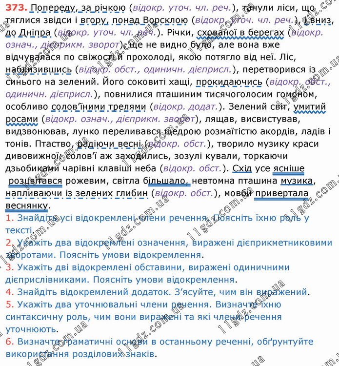Попереду, за річкою (відокр. уточ. чл. реч.), танули ліси, що тяглися звідси і вгору, понад Ворсклою (відокр. уточ. чл. реч.), і вниз, до Дніпра (відокр. уточ. чл. реч.). Річки, схованої в берегах (відокр. означ., дієприкм. зворот), ще не видно було, але вона вже відчувалася по свіжості й прохолоді, якою потягло від неї. Ліс, наблизившись (відокр. обст., одиничн. дієприсл.), перетворився із синього на зелений. Його соковиті хащі, прокидаючись (відокр. обст., одиничн. дієприсл.), повнилися пташиним тисячоголосим гомоном, особливо солов’їними трелями (відокр. додат.). Зелений світ, умитий росами (відокр. означ., дієприкм. зворот), лящав, висвистував, видзвонював, лунко переливався щедрою розмаїтістю акордів, ладів і тонів. Птаство, радіючи весні (відокр. обст.), творило музику краси дивовижної: солов’ї аж заходились, зозулі кували, торкаючи дзьобиками чарівні клавіші неба (відокр. обст.). Схід усе ясніше розцвітався рожевим, світла більшало, невтомна пташина музика, напливаючи із зелених глибин (відокр. обст.), мовби привертала веснянку. 1. Знайдіть усі відокремлені члени речення. Поясніть їхню роль у тексті. 2. Укажіть два відокремлені означення, виражені дієприкметниковими зворотами. Поясніть умови відокремлення. 3. Укажіть дві відокремлені обставини, виражені одиничними дієприслівниками. Поясніть умови відокремлення. 4. Знайдіть відокремлений додаток. З’ясуйте, чим він виражений. 5. Укажіть два уточнювальні члени речення. Визначте їхню синтаксичну роль, чим вони виражені та які члени речення уточнюють. 6. Визначте граматичні основи в останньому реченні, обґрунтуйте використання розділових знаків.