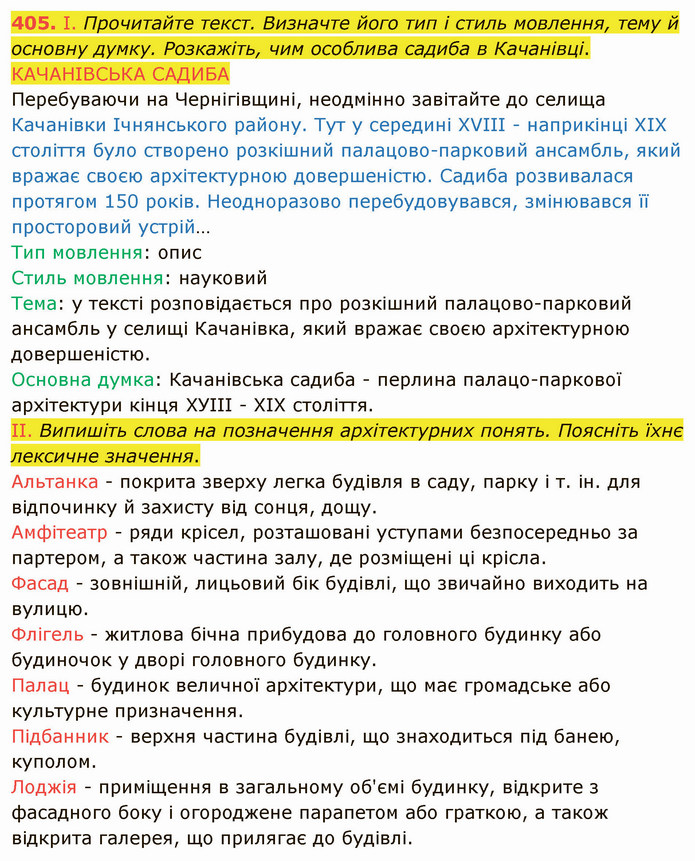 І. Прочитайте текст. Визначте його тип і стиль мовлення, тему й основну думку. Розкажіть, чим особлива садиба в Качанівці. КАЧАНІВСЬКА САДИБА Перебуваючи на Чернігівщині, неодмінно завітайте до селища Качанівки Ічнянського району. Тут у середині XVIII - наприкінці XIX століття було створено розкішний палацово-парковий ансамбль, який вражає своєю архітектурною довершеністю. Садиба розвивалася протягом 150 років. Неодноразово перебудовувався, змінювався її просторовий устрій… Тип мовлення: опис Стиль мовлення: науковий Тема: у тексті розповідається про розкішний палацово-парковий ансамбль у селищі Качанівка, який вражає своєю архітектурною довершеністю. Основна думка: Качанівська садиба - перлина палацо-паркової архітектури кінця ХУІІІ - ХІХ століття. II. Випишіть слова на позначення архітектурних понять. Поясніть їхнє лексичне значення. Альтанка - покрита зверху легка будівля в саду, парку і т. ін. для відпочинку й захисту від сонця, дощу. Амфітеатр - ряди крісел, розташовані уступами безпосередньо за партером, а також частина залу, де розміщені ці крісла. Фасад - зовнішній, лицьовий бік будівлі, що звичайно виходить на вулицю. Флігель - житлова бічна прибудова до головного будинку або будиночок у дворі головного будинку. Палац - будинок величної архітектури, що має громадське або культурне призначення. Підбанник - верхня частина будівлі, що знаходиться під банею, куполом. Лоджія - приміщення в загальному об'ємі будинку, відкрите з фасадного боку і огороджене парапетом або граткою, а також відкрита галерея, що прилягає до будівлі.