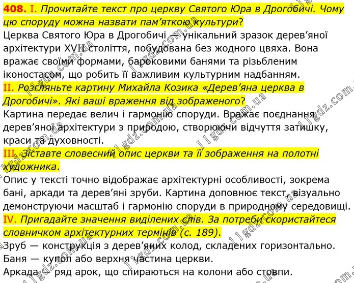 І. Прочитайте текст про церкву Святого Юра в Дрогобичі. Чому цю споруду можна назвати пам’яткою культури? Церква Святого Юра в Дрогобичі — унікальний зразок дерев’яної архітектури XVII століття, побудована без жодного цвяха. Вона вражає своїми формами, бароковими банями та різьбленим іконостасом, що робить її важливим культурним надбанням. ІІ. Розгляньте картину Михайла Козика «Дерев’яна церква в Дрогобичі». Які ваші враження від зображеного? Картина передає велич і гармонію споруди. Вражає поєднання дерев’яної архітектури з природою, створюючи відчуття затишку, краси та духовності. III. Зіставте словесний опис церкви та її зображення на полотні художника. Опис у тексті точно відображає архітектурні особливості, зокрема бані, аркади та дерев’яні зруби. Картина доповнює текст, візуально демонструючи масштаб і гармонію споруди в природному середовищі. IV. Пригадайте значення виділених слів. За потреби скористайтеся словничком архітектурних термінів (с. 189). Зруб — конструкція з дерев’яних колод, складених горизонтально. Баня — купол або верхня частина церкви. Аркада — ряд арок, що спираються на колони або стовпи.