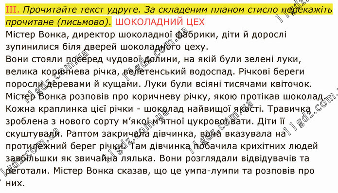 Прочитайте текст удруге. За складеним планом стисло перекажіть прочитане (письмово). ШОКОЛАДНИЙ ЦЕХ Містер Вонка, директор шоколадної фабрики, діти й дорослі зупинилися біля дверей шоколадного цеху. Вони стояли посеред чудової долини, на якій були зелені луки, велика коричнева річка, велетенський водоспад. Річкові береги поросли деревами й кущами. Луки були всіяні тисячами квіточок. Містер Вонка розповів про коричневу річку, якою протікав шоколад. Кожна краплинка цієї річки - шоколад найвищої якості. Травичка зроблена з нового сорту м’якої м’ятної цукрової вати. Діти її скуштували. Раптом закричала дівчинка, вона вказувала на протилежний берег річки. Там дівчинка побачила крихітних людей завбільшки як звичайна лялька. Вони розглядали відвідувачів та реготали. Містер Вонка сказав, що це умпа-лумпи та розповів про них.