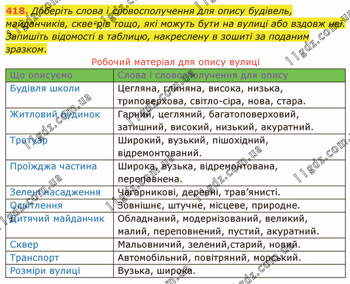 Доберіть слова і словосполучення для опису будівель, майданчиків, скверів тощо, які можуть бути на вулиці або вздовж неї. Запишіть відомості в таблицю, накреслену в зошиті за поданим зразком. Робочий матеріал для опису вулиці Що описуємо Слова і словосполучення для опису Будівля школи Цегляна, глиняна, висока, низька, триповерхова, світло-сіра, нова, стара. Житловий будинок Гарний, цегляний, багатоповерховий, затишний, високий, низький, акуратний. Тротуар Широкий, вузький, пішохідний, відремонтований. Проїжджа частина Широка, вузька, відремонтована, переповнена. Зелені насадження Чагарникові, деревні, трав’янисті. Освітлення Зовнішнє, штучне, місцеве, природне. Дитячий майданчик Обладнаний, модернізований, великий, малий, переповнений, пустий, акуратний. Сквер Мальовничий, зелений,старий, новий. Транспорт Автомобільний, повітряний, морський. Розміри вулиці Вузька, широка.