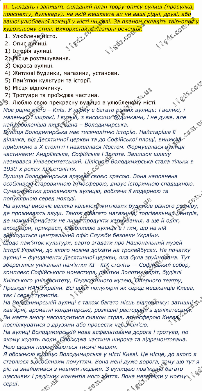 II. Складіть і запишіть складний план твору-опису вулиці (провулка, проспекту, бульвару), на якій мешкаєте ви чи ваші рідні, друзі, або вашої улюбленої локації у місті чи селі. За планом складіть твір-опис у художньому стилі. Використайте називні речення. 1. Улюблене місто. 2. Опис вулиці. 1) Історія вулиці. 2) Місце розташування. 3) Окраса вулиці. 4) Житлові будинки, магазини, установи. 5) Пам’ятки культури та історії. 6) Місця відпочинку. 7) Тротуари та проїжджа частина. 3. Люблю свою прекрасну вулицю в улюбленому місті. Моє рідне місто – Київ. У ньому є багато різних вулиць: і великі, і маленькі, і широкі, і вузькі, з високими будинками, і не дуже, але найулюбленіша лише одна – Володимирська. Вулиця Володимирська має тисячолітню історію. Найстаріша її ділянка, від Десятинної церкви та до Софійської площі, виникла приблизно в Х столітті і називалася Мостом. Формувалася вулиця частинами: Андріївська, Софійська і Золота. Залишок шляху називався Університетський. Цілісною Володимирська стала тільки в 1930-х роках ХIХ століття. Вулиця Володимирська вражає своєю красою. Вона наповнена особливою старовинною атмосферою, дивує історичною спадщиною. Сучасні нотки доповнюють вулицю, роблячи її модерною та популярною серед молоді. На вулиці височіє велика кількість житлових будинків різного розміру, де проживають люди. Також є багато магазинів, торгівельних центрів, де можна придбати не лише продукти харчування, а ще й одяг, аксесуари, прикраси. Особливою вулиця є і тим, що на ній знаходиться центральний офіс Служби безпеки України. Щодо пам’яток культури, варто згадати про Національний музей історії України, до якого можна доїхати на тролейбусах. На початку вулиці – фундаменти Десятинної церкви, яка була зруйнована. Тут збереглися унікальні пам'ятки XI—XIX століть — Софійський собор, комплекс Софійського монастиря, рештки Золотих воріт, будівлі Київського університету, Педагогічного музею, Оперного театру, Президії НАН України. Всі вони популярні як серед мешканців Києва, так і серед туристів. На Володимирській вулиці є також багато місць відпочинку: затишні кав’ярні, ароматні кондитерські, розкішні ресторани з делікатесами. Ви маєте змогу насолодитися смаком страв, атмосферою Києва, поспілкуватися з друзями або провести час з сім’єю. На вулиці Володимирській нова асфальтована дорога і тротуар, по якому ходять люди. Проїжджа частина широка та відремонтована. Нею щодня пересуваються тисячі машин. Я обожнюю вулицю Володимирська у місті Києві. Це місце, до якого я ставлюся з особливим почуттям. Вона мені дуже дорога, тому що тут я ріс та знайомився з новими людьми. З вулицею пов’язано багато щасливих і радісних моментів мого життя. Вона назавжди у моєму серці.
