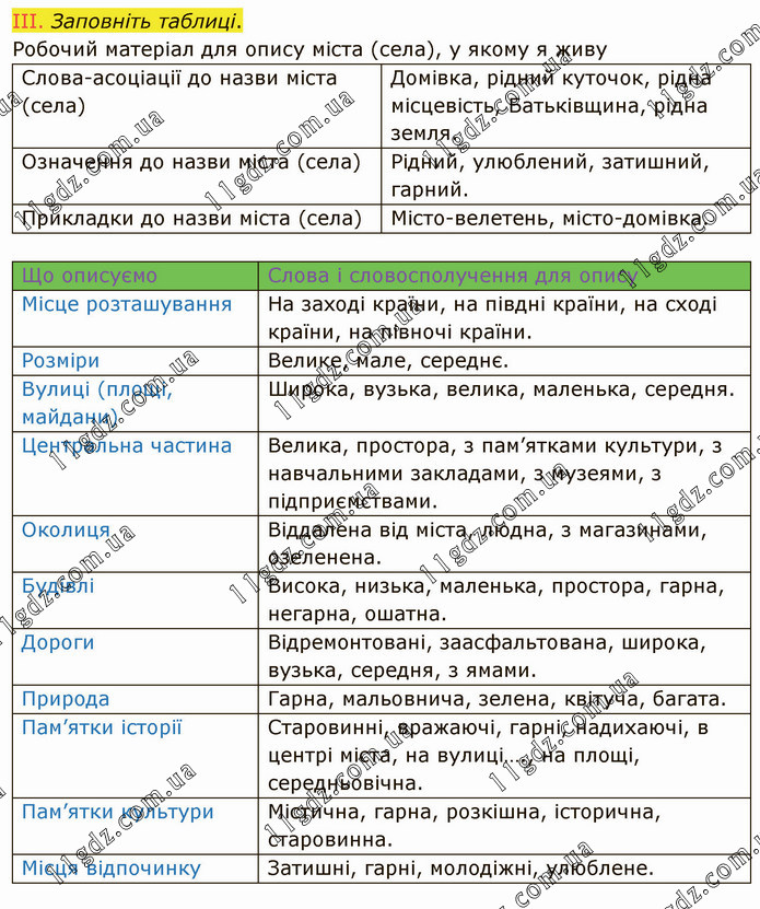 Заповніть таблиці. Робочий матеріал для опису міста (села), у якому я живу Слова-асоціації до назви міста (села) Домівка, рідний куточок, рідна місцевість, Батьківщина, рідна земля. Означення до назви міста (села) Рідний, улюблений, затишний, гарний. Прикладки до назви міста (села) Місто-велетень, місто-домівка. Що описуємо Слова і словосполучення для опису Місце розташування На заході країни, на півдні країни, на сході країни, на півночі країни. Розміри Велике, мале, середнє. Вулиці (площі, майдани) Широка, вузька, велика, маленька, середня. Центральна частина Велика, простора, з пам’ятками культури, з навчальними закладами, з музеями, з підприємствами. Околиця Віддалена від міста, людна, з магазинами, озеленена. Будівлі Висока, низька, маленька, простора, гарна, негарна, ошатна. Дороги Відремонтовані, заасфальтована, широка, вузька, середня, з ямами. Природа Гарна, мальовнича, зелена, квітуча, багата. Пам’ятки історії Старовинні, вражаючі, гарні, надихаючі, в центрі міста, на вулиці…., на площі, середньовічна. Пам’ятки культури Містична, гарна, розкішна, історична, старовинна. Місця відпочинку Затишні, гарні, молодіжні, улюблене.