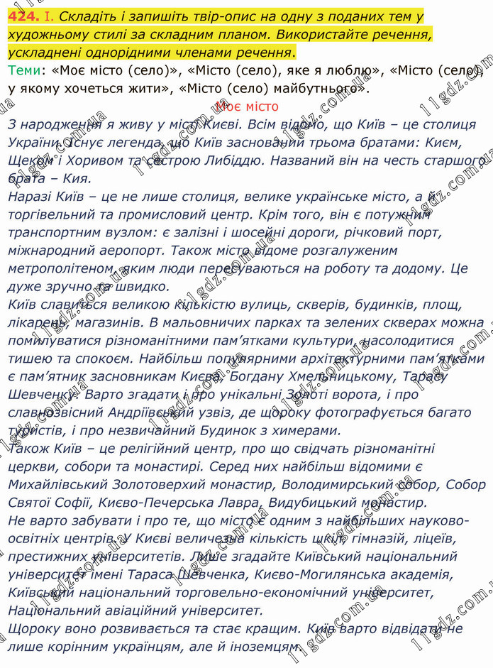 І. Складіть і запишіть твір-опис на одну з поданих тем у художньому стилі за складним планом. Використайте речення, ускладнені однорідними членами речення. Теми: «Моє місто (село)», «Місто (село), яке я люблю», «Місто (село), у якому хочеться жити», «Місто (село) майбутнього». Моє місто З народження я живу у місті Києві. Всім відомо, що Київ – це столиця України. Існує легенда, що Київ заснований трьома братами: Києм, Щеком і Хоривом та сестрою Либіддю. Названий він на честь старшого брата – Кия. Наразі Київ – це не лише столиця, велике українське місто, а й торгівельний та промисловий центр. Крім того, він є потужним транспортним вузлом: є залізні і шосейні дороги, річковий порт, міжнародний аеропорт. Також місто відоме розгалуженим метрополітеном, яким люди пересуваються на роботу та додому. Це дуже зручно та швидко. Київ славиться великою кількістю вулиць, скверів, будинків, площ, лікарень, магазинів. В мальовничих парках та зелених скверах можна помилуватися різноманітними пам’ятками культури, насолодитися тишею та спокоєм. Найбільш популярними архітектурними пам’ятками є пам’ятник засновникам Києва, Богдану Хмельницькому, Тарасу Шевченку. Варто згадати і про унікальні Золоті ворота, і про славнозвісний Андріївський узвіз, де щороку фотографується багато туристів, і про незвичайний Будинок з химерами. Також Київ – це релігійний центр, про що свідчать різноманітні церкви, собори та монастирі. Серед них найбільш відомими є Михайлівський Золотоверхий монастир, Володимирський собор, Собор Святої Софії, Києво-Печерська Лавра, Видубицький монастир. Не варто забувати і про те, що місто є одним з найбільших науково-освітніх центрів. У Києві величезна кількість шкіл, гімназій, ліцеїв, престижних університетів. Лише згадайте Київський національний університет імені Тараса Шевченка, Києво-Могилянська академія, Київський національний торговельно-економічний університет, Національний авіаційний університет. Щороку воно розвивається та стає кращим. Київ варто відвідати не лише корінним українцям, але й іноземцям.