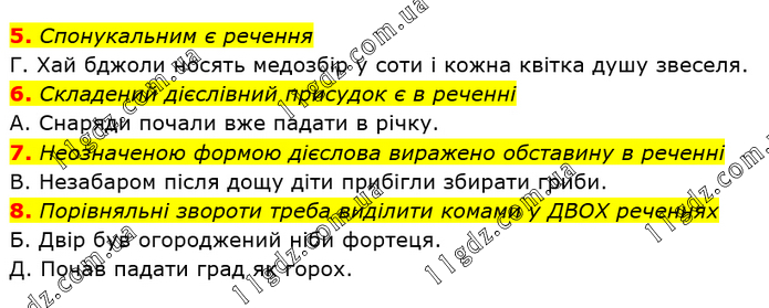5. Спонукальним є речення Г. Хай бджоли носять медозбір у соти і кожна квітка душу звеселя. 6. Складений дієслівний присудок є в реченні А. Снаряди почали вже падати в річку. 7. Неозначеною формою дієслова виражено обставину в реченні В. Незабаром після дощу діти прибігли збирати гриби. 8. Порівняльні звороти треба виділити комами у ДВОХ реченнях Б. Двір був огороджений ніби фортеця. Д. Почав падати град як горох.