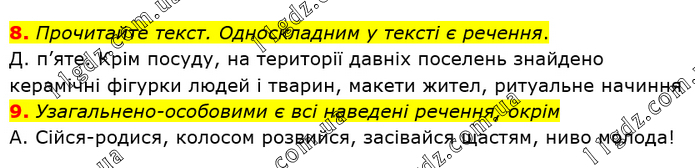 Прочитайте текст. Односкладним у тексті є речення. Д. п’яте. Крім посуду, на території давніх поселень знайдено керамічні фігурки людей і тварин, макети жител, ритуальне начиння 9. Узагальнено-особовими є всі наведені речення, окрім А. Сійся-родися, колосом розвийся, засівайся щастям, ниво молода!
