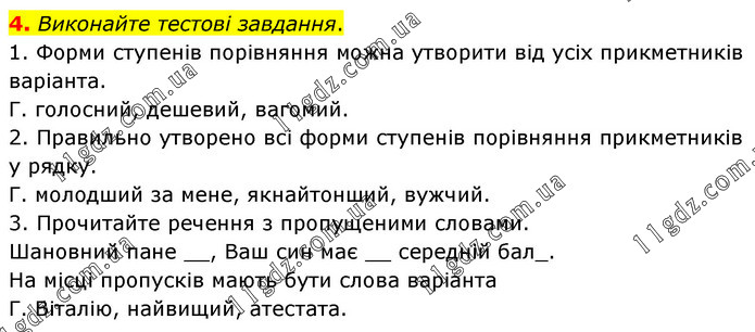 Виконайте тестові завдання. 1. Форми ступенів порівняння можна утворити від усіх прикметників варіанта. Г. голосний, дешевий, вагомий. 2. Правильно утворено всі форми ступенів порівняння прикметників у рядку. Г. молодший за мене, якнайтонший, вужчий. 3. Прочитайте речення з пропущеними словами. Шановний пане __, Ваш син має __ середній бал_. На місці пропусків мають бути слова варіанта Г. Віталію, найвищий, атестата.