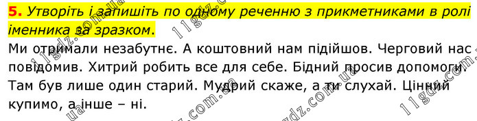 Утворіть і запишіть по одному реченню з прикметниками в ролі іменника за зразком. Ми отримали незабутнє. А коштовний нам підійшов. Черговий нас повідомив. Хитрий робить все для себе. Бідний просив допомоги. Там був лише один старий. Мудрий скаже, а ти слухай. Цінний купимо, а інше – ні.