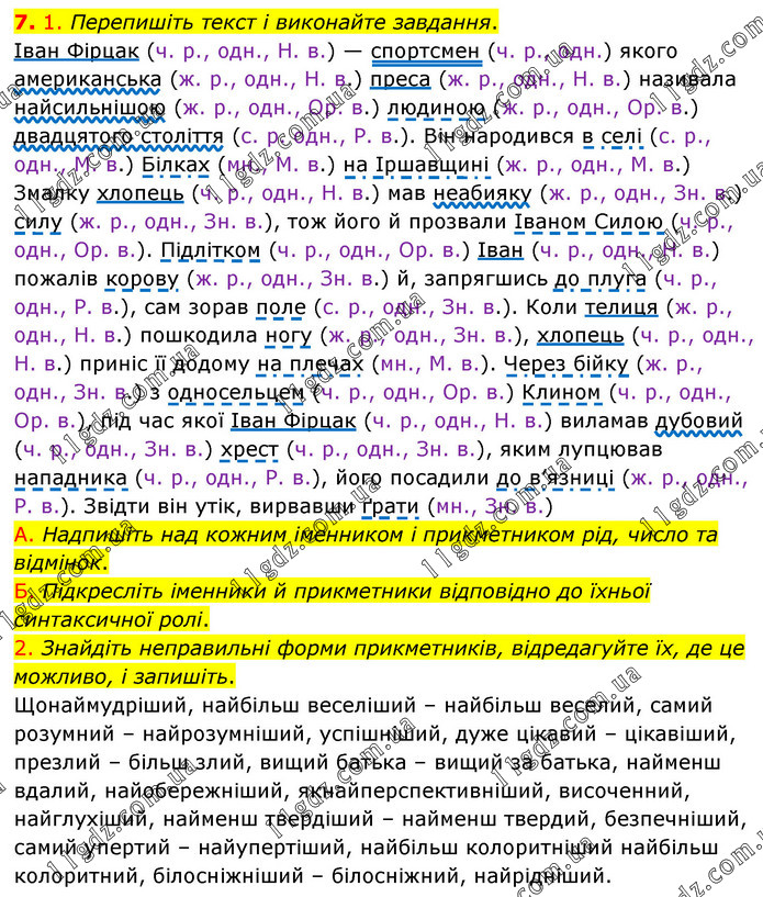 1. Перепишіть текст і виконайте завдання. Іван Фірцак (ч. р., одн., Н. в.) — спортсмен (ч. р., одн.) якого американська (ж. р., одн., Н. в.) преса (ж. р., одн., Н. в.) називала найсильнішою (ж. р., одн., Ор. в.) людиною (ж. р., одн., Ор. в.) двадцятого століття (с. р. одн., Р. в.). Він народився в селі (с. р., одн., М. в.) Білках (мн., М. в.) на Іршавщині (ж. р., одн., М. в.) Змалку хлопець (ч. р., одн., Н. в.) мав неабияку (ж. р., одн., Зн. в.) силу (ж. р., одн., Зн. в.), тож його й прозвали Іваном Силою (ч. р., одн., Ор. в.). Підлітком (ч. р., одн., Ор. в.) Іван (ч. р., одн., Н. в.) пожалів корову (ж. р., одн., Зн. в.) й, запрягшись до плуга (ч. р., одн., Р. в.), сам зорав поле (с. р., одн., Зн. в.). Коли телиця (ж. р., одн., Н. в.) пошкодила ногу (ж. р., одн., Зн. в.), хлопець (ч. р., одн., Н. в.) приніс її додому на плечах (мн., М. в.). Через бійку (ж. р., одн., Зн. в.) з односельцем (ч. р., одн., Ор. в.) Клином (ч. р., одн., Ор. в.), під час якої Іван Фірцак (ч. р., одн., Н. в.) виламав дубовий (ч. р., одн., Зн. в.) хрест (ч. р., одн., Зн. в.), яким лупцював нападника (ч. р., одн., Р. в.), його посадили до в’язниці (ж. р., одн., Р. в.). Звідти він утік, вирвавши ґрати (мн., Зн. в.) А. Надпишіть над кожним іменником і прикметником рід, число та відмінок. Б. Підкресліть іменники й прикметники відповідно до їхньої синтаксичної ролі. 2. Знайдіть неправильні форми прикметників, відредагуйте їх, де це можливо, і запишіть. Щонаймудріший, найбільш веселіший – найбільш веселий, самий розумний – найрозумніший, успішніший, дуже цікавий – цікавіший, презлий – більш злий, вищий батька – вищий за батька, найменш вдалий, найобережніший, якнайперспективніший, височенний, найглухіший, найменш твердіший – найменш твердий, безпечніший, самий упертий – найупертіший, найбільш колоритніший найбільш колоритний, білосніжніший – білосніжний, найрідніший.